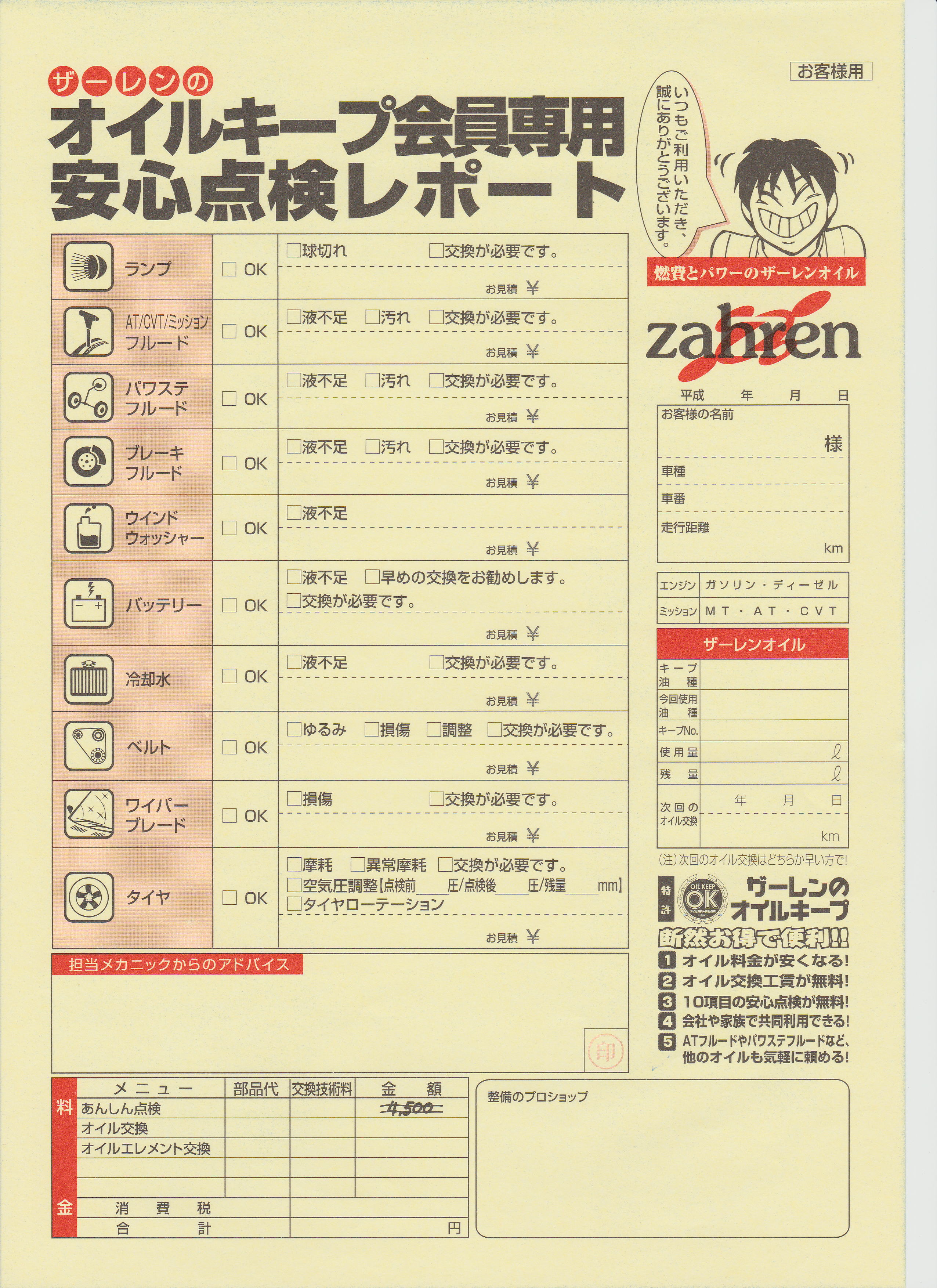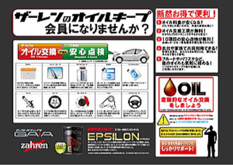 *エレメント交換工賃無料・廃油処分量も無料です,キープされたオイルは鮮度を保つためチケット換算で当社で管理いたします、ザーレンオリジナル10項目無料診断付でオイル交換毎に点検おさせて頂きます、ただ見るのでは無くテスターや機械を使い点検いたしますエレメント交換時期や定期交換部品の交換目安もお客様に、ご提案いたしますのでご安心してドライブしていただけます。